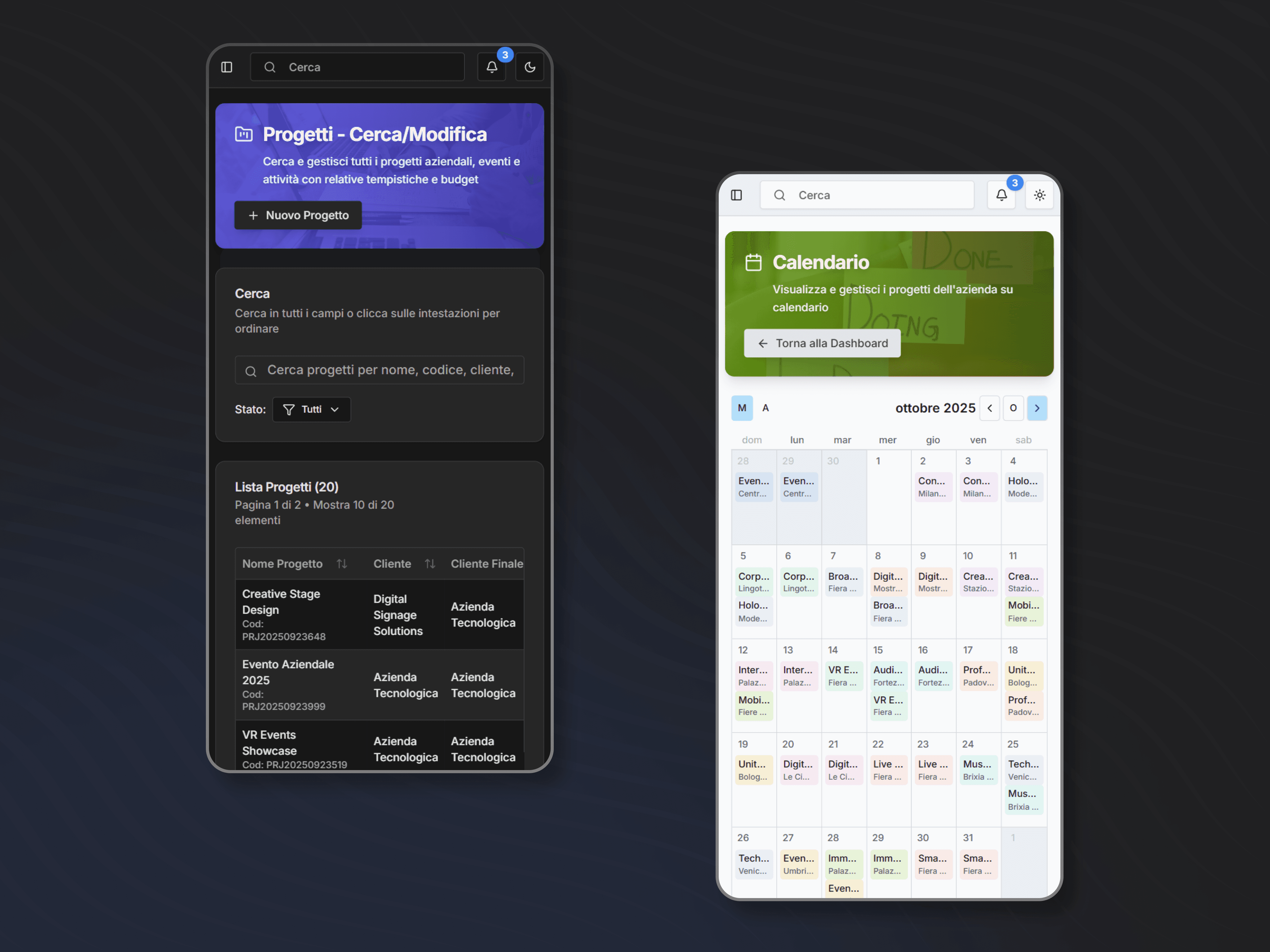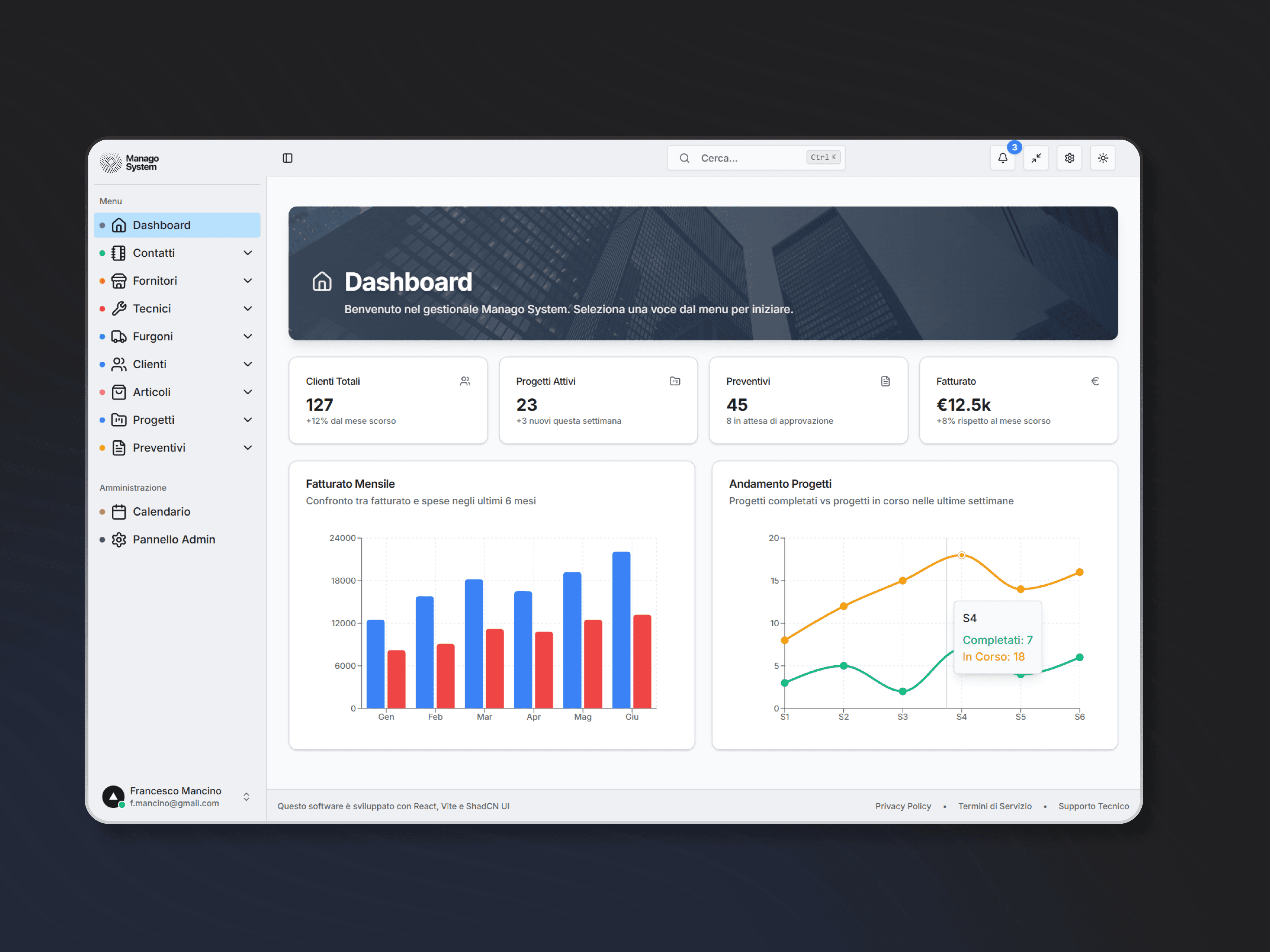 Ho sviluppato un'architettura full-stack moderna: backend API REST con ASP.NET Core 8.0, Entity Framework Core e SQL Server, frontend React 19 con Vite, Tailwind CSS e Shadcn/UI. Il sistema implementa autenticazione JWT, sistema di permessi granulare basato su ruoli (admin/user/supervisor), oltre 35 servizi business e 35+ controller API. L'interfaccia segue l'Atomic Design pattern con tema dark/light/system, dashboard interattiva con statistiche real-time e CRUD completi per ogni entità.