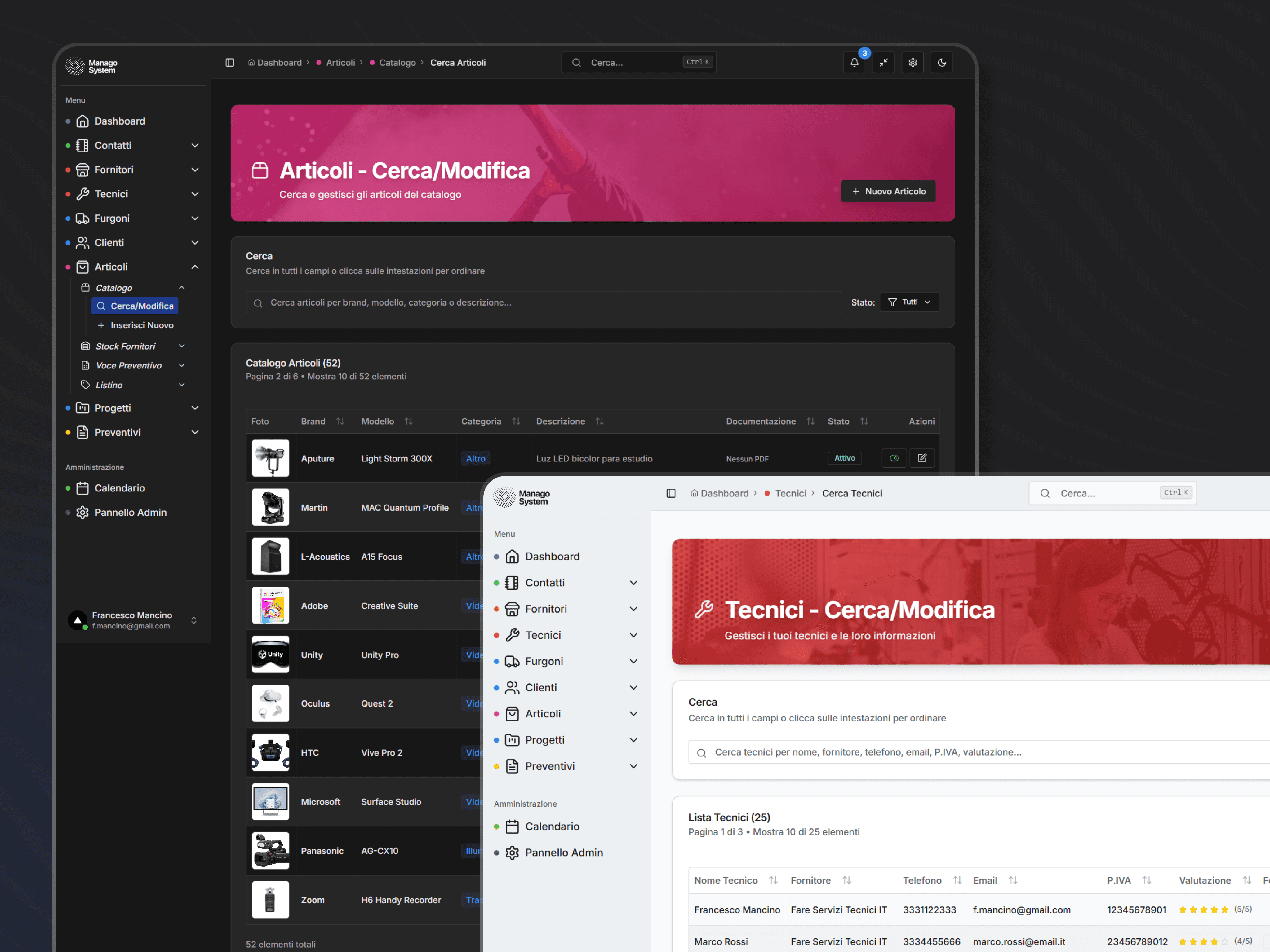 Manago System è un gestionale enterprise completo sviluppato per ottimizzare la gestione operativa di un'azienda del settore eventi e tecnologia. Il sistema centralizza clienti, fornitori, tecnici, progetti, preventivi, articoli e magazzino in un'unica piattaforma web, eliminando fogli Excel e processi manuali. L'obiettivo era creare una soluzione scalabile, sicura e performante per oltre 40 entità database interconnesse.